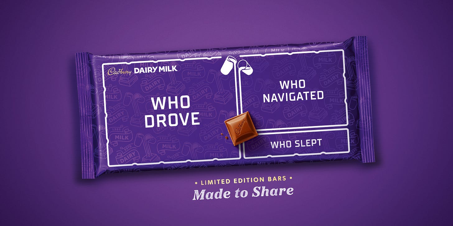 영국에서 광고제의 스포트라이트를 받은 초콜릿 패키지가 등장했어요. 주인공은 캐드버리(Cadbury)의 ‘데어리 밀크’. 100년 넘게 영국인의 일상에서 사랑받아 온 국민 초콜릿이죠. 이 익숙한 초콜릿이 유쾌한 변신을 시도했어요. 이름하여, ‘나누기 위한 초콜릿(Made to Share)’.