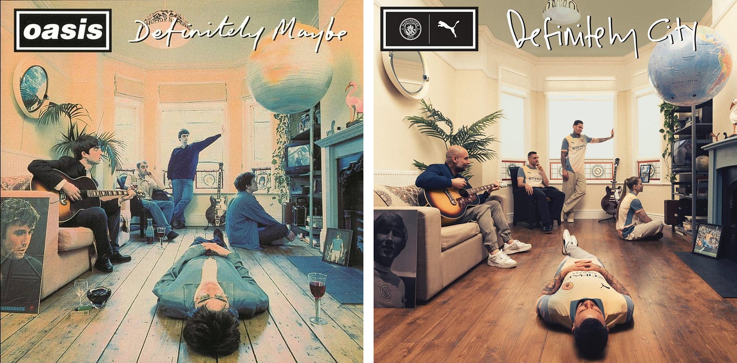 이 트렌드에 오아시스가 사랑하는 스포츠가 빠질 수 없죠. 오아시스는 축구팀 '맨체스터 시티 FC’의 오랜 팬인데요. 밴드와 구단 모두 맨체스터 출신으로, 도시를 대표하며 같은 지역 팬층을 공유하고 있어요. 그래서 이번 재결합을 기념해 콜라보를 진행했죠. 팀 유니폼과 머플러, 티셔츠 등에 오아시스 1집 앨범 아트워크를 입혀 상징적인 굿즈를 만들었어요. 거기에, 앨범 커버를 그대로 재현한 화보로 화제를 모았죠. 이 협업은 맨체스터의 문화를 사랑하는 팬들에게 자부심을 안겨주었답니다.