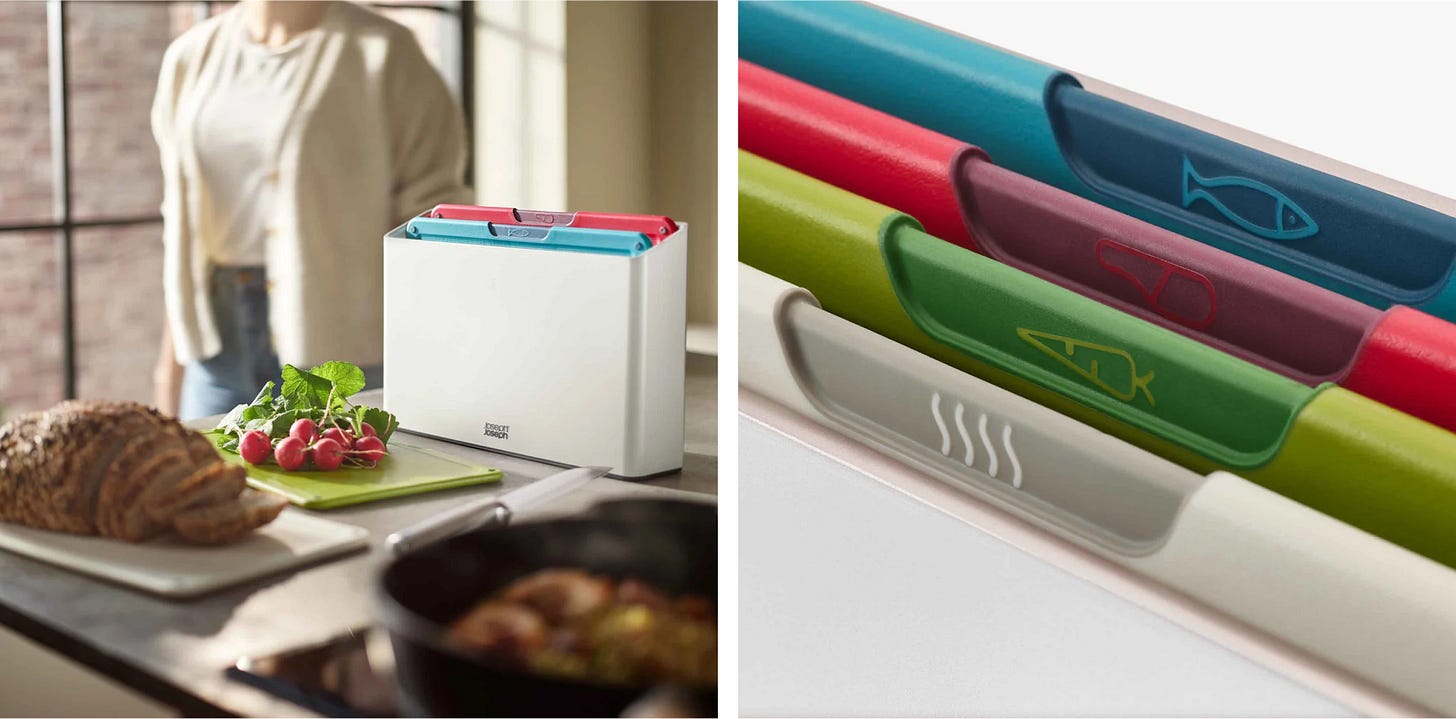 도마는 한 장으로 부족해요. 고기를 자르던 도마에 채소를 올리는 순간, 교차 오염이 되기 십상이니까요. 조셉 조셉은 여기에 아주 직관적인 해법을 제시했어요. 도마 4장에 각각 고기, 생선, 채소, 익힌 음식의 아이콘을 넣고 색상을 다르게 구분했죠. 헷갈리지 않도록, 각 도마의 역할을 명확하게 나눈 거예요. 이 제품은 조셉 조셉을 대표하는 베스트 셀러로, 브랜드 철학을 가장 잘 보여주는 제품이 되었어요.
