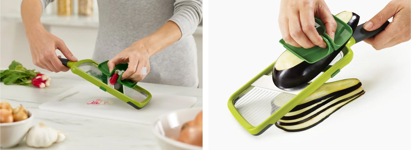 슬라이서를 쓸 때 무서운 순간은? 재료가 얇아지면서 손이 칼날에 가까워질 때예요. 조금만 방심하면 손끝이 닿을까봐 긴장하게 되죠. 이 제품은 슬라이서에 그립을 더해, 불안을 없애줘요. 손으로 집기 어려울만큼 작거나, 단면이 둥글거나, 모양이 길쭉한 재료 등 상황에 따라 세 가지 다른 방식으로 그립을 고정할 수 있어요. 덕분에 미끄러질 걱정 없이, 원하는 두께대로 과일이나 채소를 안전하게 썰 수 있죠. 긴장을 덜어내니, 조리 속도도 훨씬 빨라지고요.