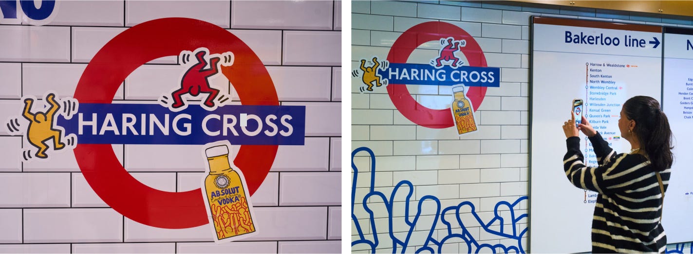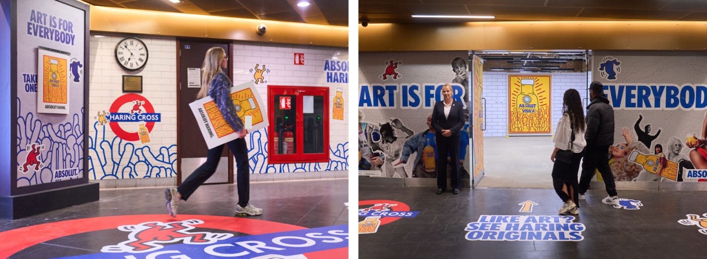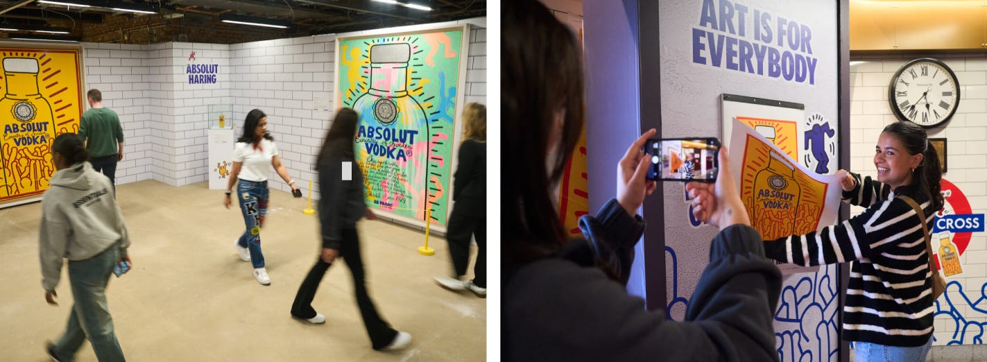 그래서 이번 ‘해링 크로스’에서는 그 상징을 새롭게 되살렸어요. 키스 해링이 1986년에 앱솔루트를 위해 제작한 오리지널 작품 두 점이 영국에서 처음 공개됐어요. 노란 배경 위에 빨간 선과 경쾌한 인체 드로잉이 어우러진 작품은 수십 년이 지난 지금도 여전히 생생한 에너지를 품고 있었죠. 여기에 한발 더 나아가, 시민들에게 예술을 소장하는 경험을 선물했는데요. 포스터를 무료로 나눠주며, 키스해링의 작품을 집으로 데려갈 수 있게 한 거예요.