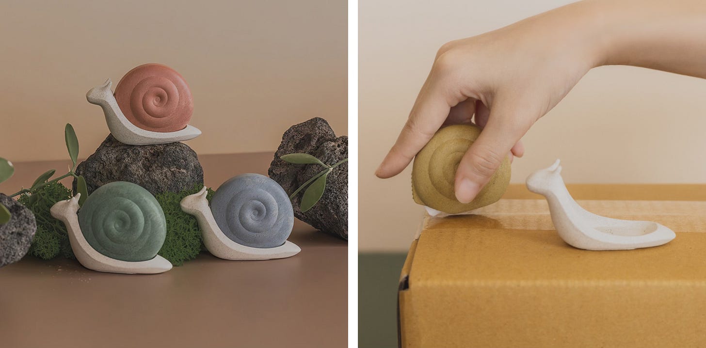 누구나 택배 언박싱을 하다가 이런 경험해 본 적 있을 거예요. 급하게 상자를 뜯다가 박스에 손이 베이거나, 칼을 찾지 못해 박스 여는 데 한참이 걸렸던 경험 말이죠. 하지만 피그랩의 작은 달팽이가 있다면, 택배 상자를 열 때마다 느끼는 설렘을 지킬 수 있어요. 달팽이 몸을 분리하면 커터 칼로 사용할 수 있거든요. 택배 박스부터 비닐, 편지 봉투, 음료수 라벨, 배달 음식 씰링까지 전부 안전하고 깨끗하게 뜯을 수 있죠. 중요한 건 이 커터가 폐목재를 재활용한 ‘무독성 친환경 목재’로 만들었다는 사실이에요. 형태는 국내 멸종위기 2급 종인 참달팽이를 모티브로 해, 사용할 때마다 환경에 관한 경각심을 불러일으키게끔 했죠.