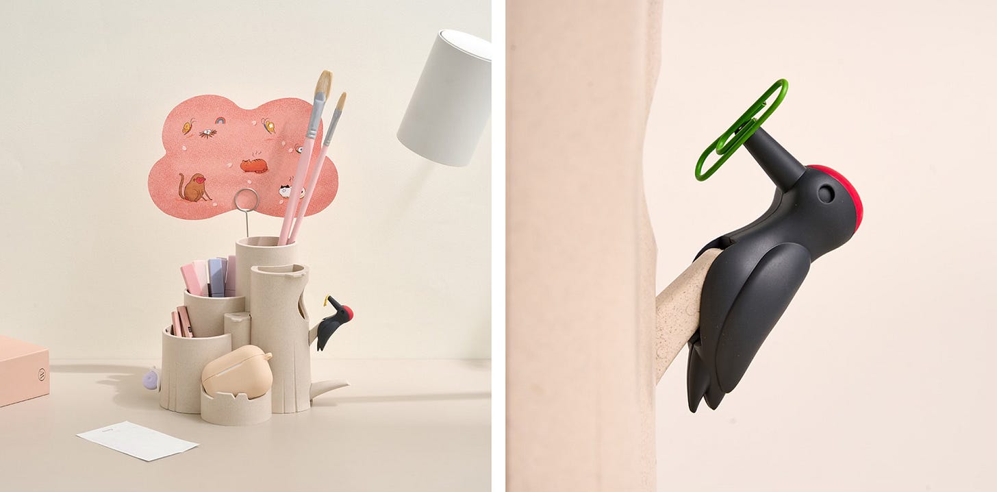 멸종위기종 까막딱따구리에서 영감을 얻은 이 제품은 폐목재와 칫솔을 생산하고 남은 자투리로 만든 다기능 연필꽂이예요. 숲을 형상화한 형태로 만든 뒤, 그 안에 연필꽂이부터 명함꽂이, 연필깎이, 스마트폰 거치대, 클립 홀더의 기능을 모두 넣었죠. 이중에서 주인공은 까막딱따구리예요. 하단에 달린 나뭇가지 버튼을 누르면 딱따구리가 클립을 물고 나오거든요. 피그랩다운 상상력을 활용해 업사이클링 아이디어를 감각적으로 제안한 사례예요.