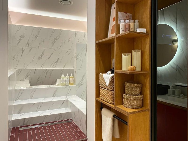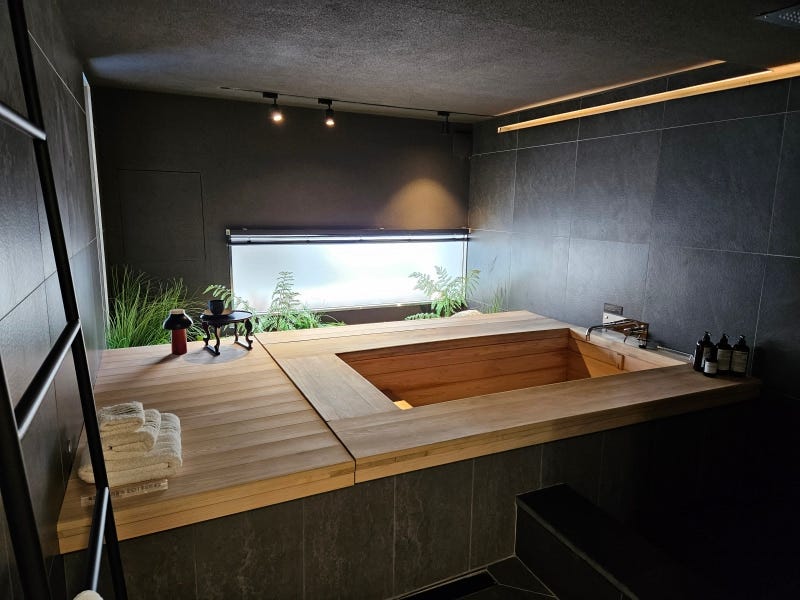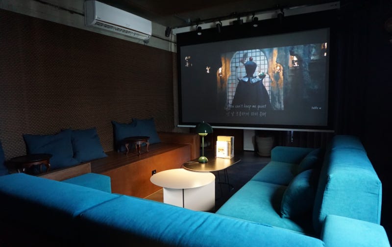 후암연립의 각 공간에는 딱 필요한 가재만 존재해요. 3평짜리 후암 제빵실에는 커다란 오븐, 각종 베이킹 용품과 테이블이, 후암거실에는 ‘ㄷ’자 형태 쇼파, 좌석과 대형 스크린, 5.1채널 스피커만이 자리를 차지하죠. 1인용 리프레쉬 공간인 후암별채에서는 온전히 목욕에 집중할 수 있도록 TV 등 다른 방해 요소를 일부러 넣지 않았어요.