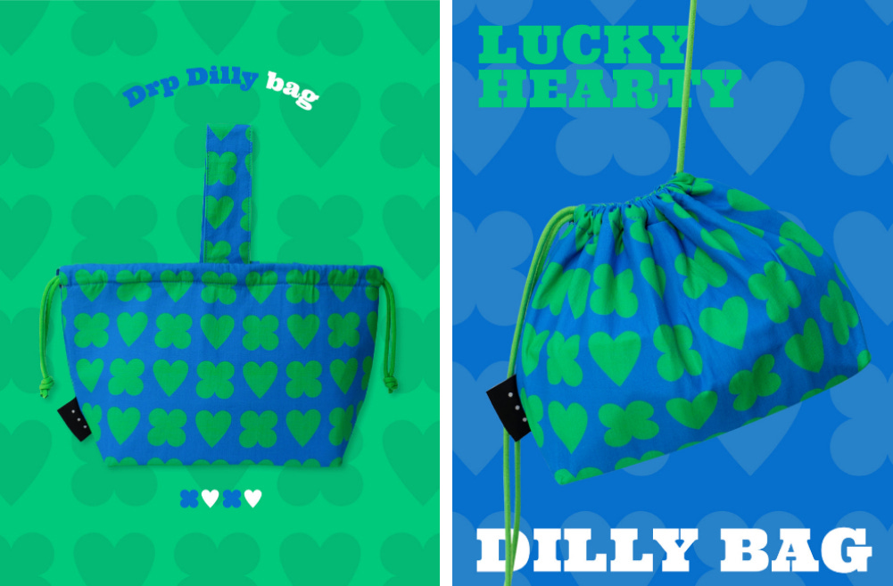 손잡이가 하나만 달린 사랑스럽고 귀여운 모양의 미니 토트백이에요. 내부를 은박 단열제로 제작한 덕분에 보온, 보냉이 가능해 도시락 가방으로 사용할 수 있을 뿐만 아니라, 스트링을 조이면 키치한 패션 아이템이 되기도 하죠. 패턴의 이름은 ‘럭키하티 그린베리(LUCKY HEARTY GREENBERRY)'. 일상에 언제나 행운과 사랑이 깃들기를 바라는 마음으로 그려넣은 거예요.