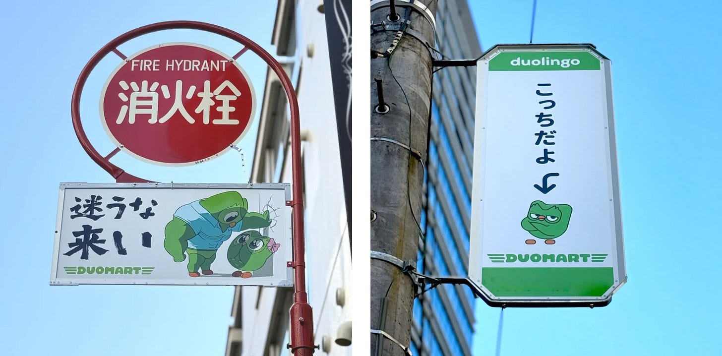 홍보 방식도 듀오링고답게 위트가 있었어요. 팝업 오픈 전, 시부야에는 듀오마트의 위치를 맞추는 퀴즈가 펼쳐졌는데요. 거리 곳곳에는 듀오 캐릭터와 화살표가 그려진 힌트 간판 20개가 설치됐어요. 목적지는 공개하지 않은 채, 사람들이 직접 힌트를 따라 걸으며 위치를 찾아보게 한 거예요. 간판을 발견한 사람들은 이를 SNS에 공유하며 자연스럽게 온라인에 확산 되었어요.
