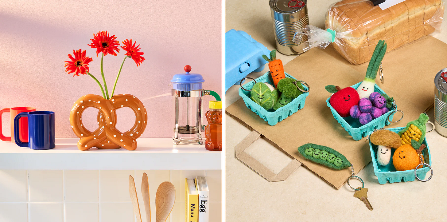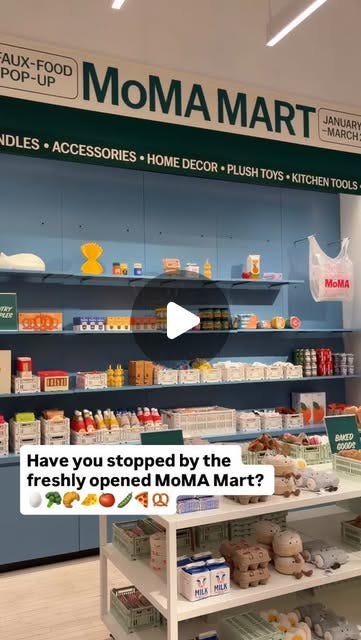 이 팝업은 모마 디자인 스토어(MoMA Design Store)에서 기간 한정으로 여는 ‘모마 마트’예요. 모마 마트는 실제 마트를 모방했다기 보다는, 식료품 마트라는 개념을 가지고 노는 공간이에요. 토마토, 샌드위치, 피자 조각 등 일상적인 식재료의 탈을 쓴 디자인 오브제들을 판매하거든요. 예를 들어 프레첼 모양의 꽃병, 통조림 형태의 파우치, 크로아상 모양의 램프 등 언뜻 보면 음식처럼 보이지만 실제로는 라이프스타일 제품들을 선보이는 거예요.