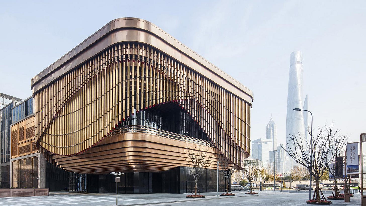 푸싱 아트센터는 토마스 헤더윅이 세계적 건축 설계사 포스터앤드파트너스(Foster + Partners)와 함께 설계한 복합 문화 공간이에요. 전통 중국식 극장에서 영감을 받아 디자인했죠. 독특한 점은 건물이 ‘춤춘다’는 것인데요. 건물이 어떻게 춤을 출까요?