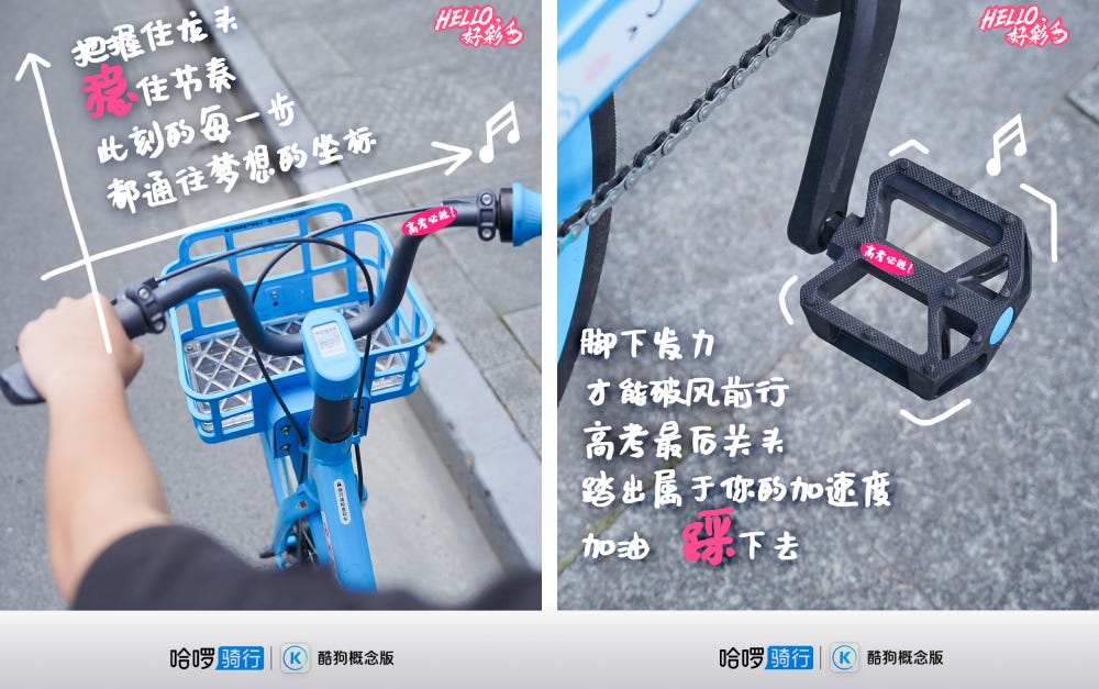 하얼로 자전거는 대학 입시 시즌을 맞아 음악 스트리밍 플랫폼 ‘쿠거우’와 함께 수험생 응원 캠페인을 선보였어요. 수험생을 위한 ‘HELLO 행운 자전거’를 배치하고, 본체에 ‘출발부터 압도!, 페달을 세차게 밟아, 성적은 쭉쭉 상승 중’ 등 응원 문구를 부착했죠. 그렇다면 쿠거우의 역할은 뭐냐고요? 쿠거우는 수험생을 위한 격려 플레이리스트와 함께 10만 개의 VIP 음악 이용권을 무료 배포해, 음악으로 수험생의 멘탈을 응원했어요.