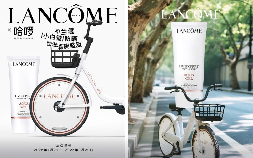 하얼로 자전거는 뷰티 브랜드 랑콤과 손잡고 자외선 지수를 알려주는 한정판 자전거 400대를 선보였어요. 이 자전거는 자외선에 따라 뒷바퀴의 색이 변해서, 사람들에게 자외선의 영향력과 선크림의 중요성을 자연스럽게 알려줘요. 또, 이벤트 기간 동안 샤오홍슈에다가 관련 해시태그로 게시글을 올리면 랑콤 선크림을 받을 수 있는 추첨에 자동 참여되기도 하죠. 한여름 뜨거운 태양 아래에서도 라이딩의 낭만을 포기할 수 없다면 선크림 꼭 챙겨야겠죠?