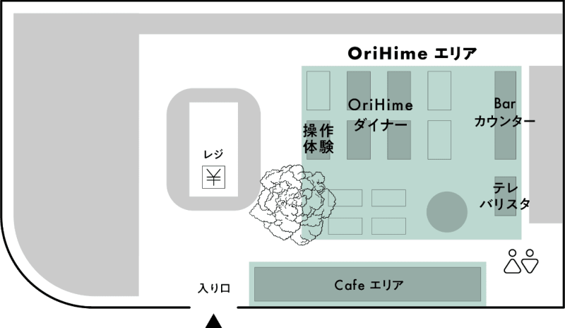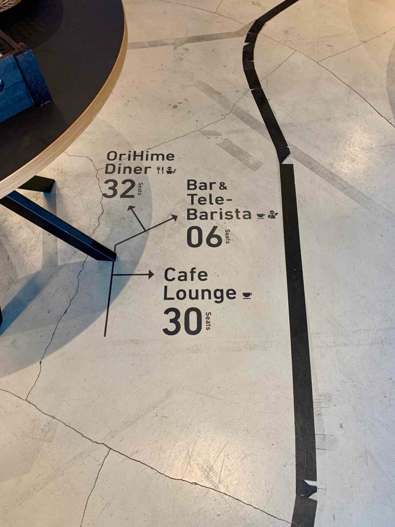 가장 먼저, 고객들이 식사하는 공간인 ‘오리히메 다이너’예요. 키가 120cm쯤 되는 ‘오리히메-D(OriHime-D)’가 바닥의 라인과 QR 코드를 따라 이동하며 고객들을 안내하죠. 테이블에 도착하면 그보다 훨씬 작은 소형 모델인 23cm 짜리 오리히메가 보여요. 파일럿은 원격 조종을 통해 오리히메의 손, 목, 얼굴 표정을 움직여 고객에게 주문 방법을 알려주죠. 고객이 스마트폰으로 QR 코드에 접속해 메뉴를 주문하면, 매장 구석구석을 오갈 수 있는 오리히메-D가 주방 직원으로부터 음식을 받아 서빙해요.