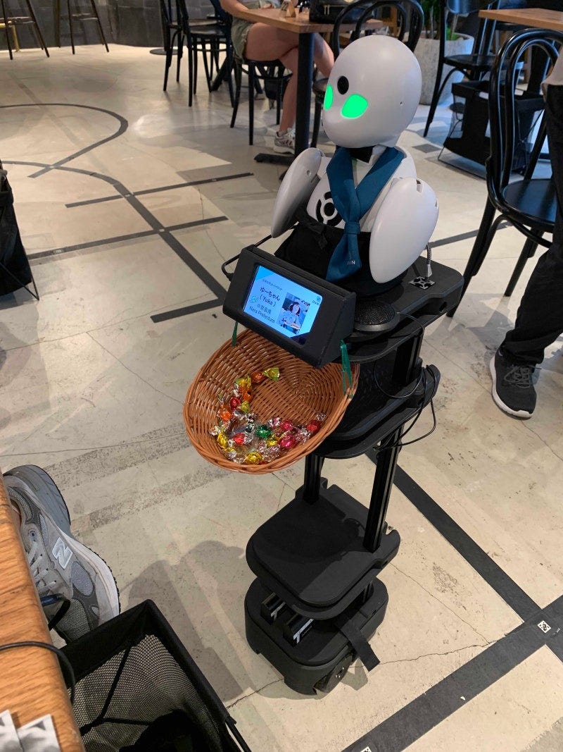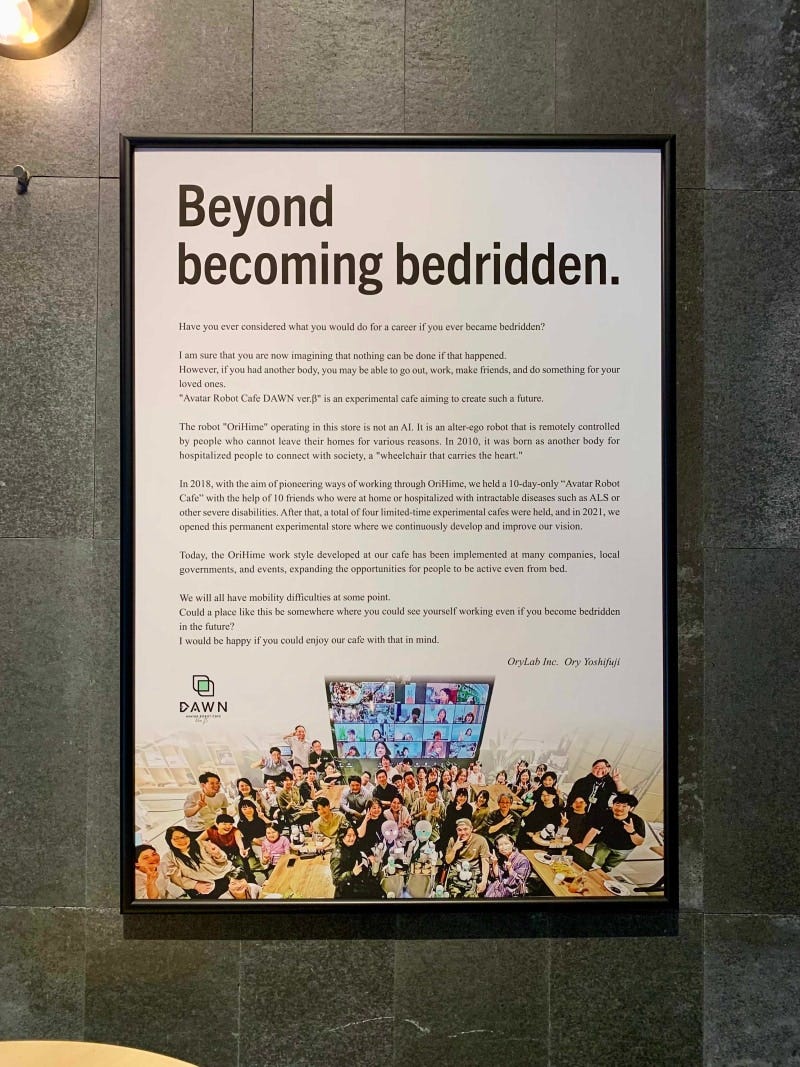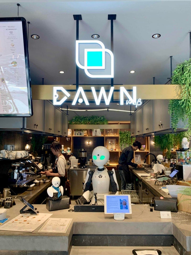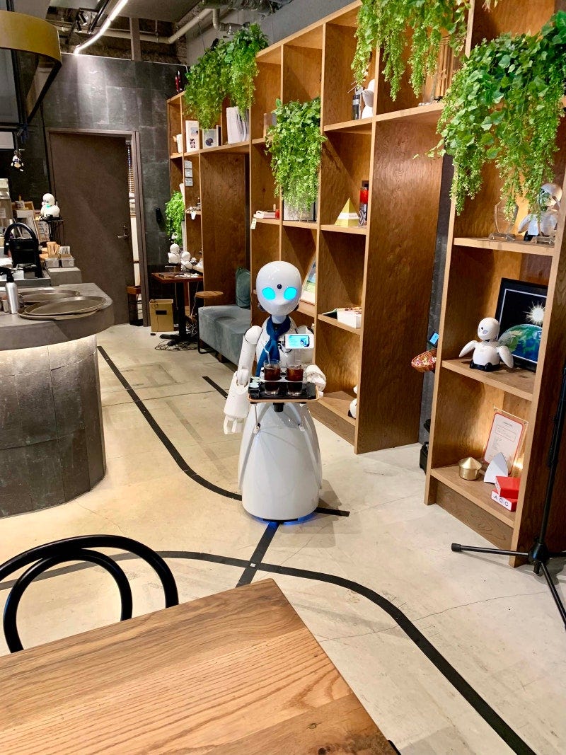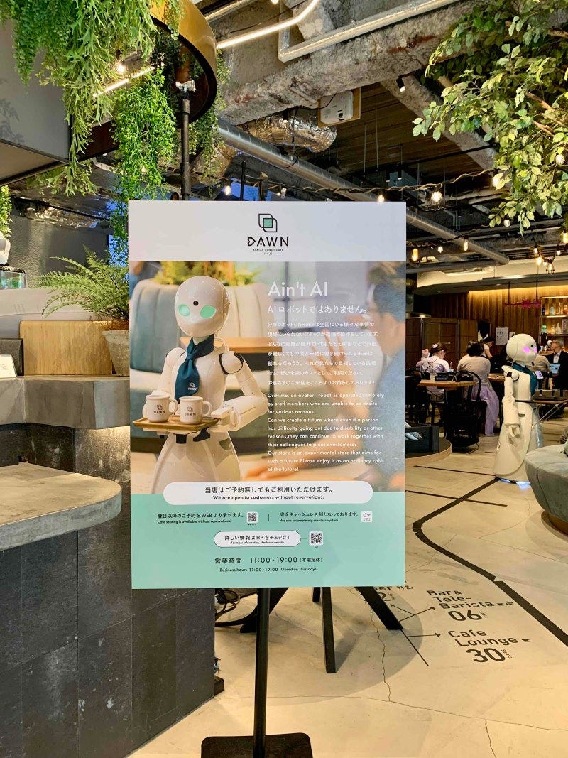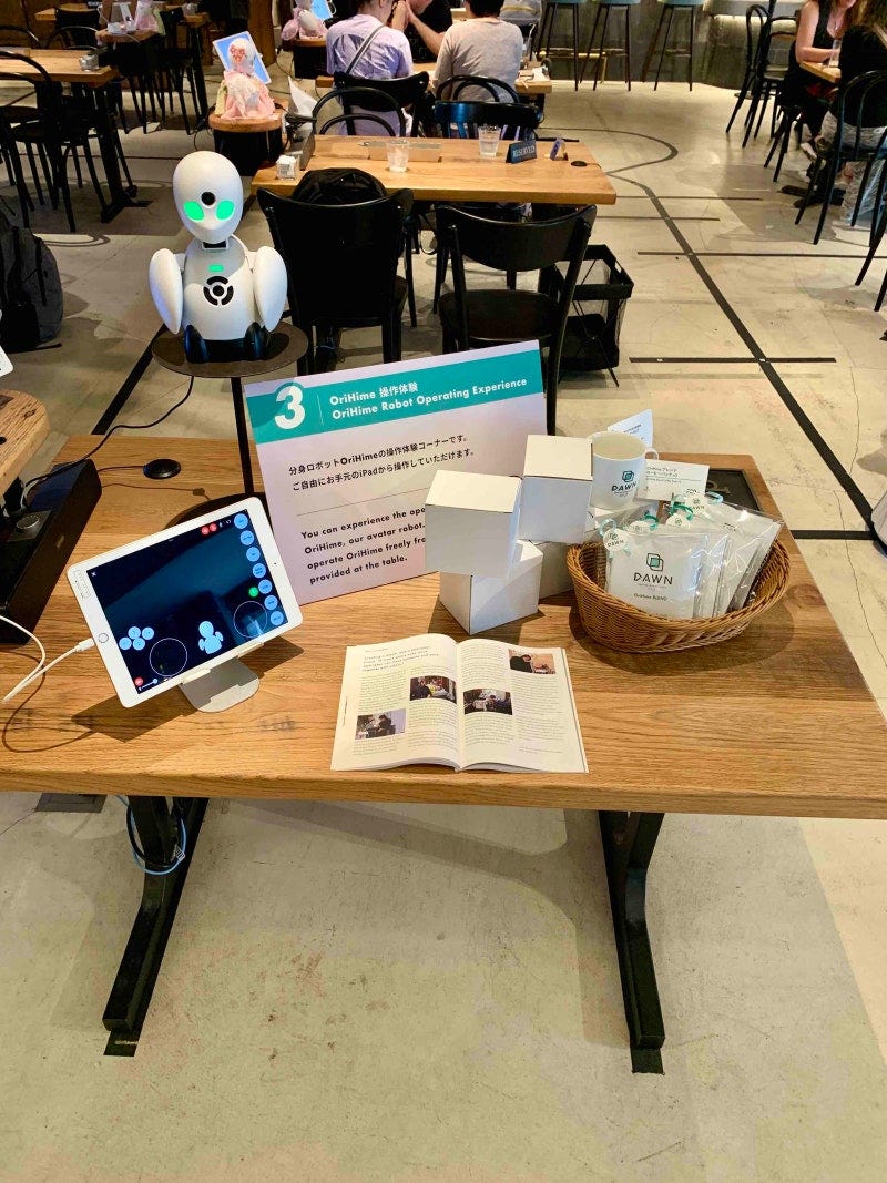 이 카페의 이름은 ‘아바타 로봇 카페 던 버전 베타(Avatar Robot Cafe DAWN ver.β)’예요. 카페 안으로 들어가면 ‘오리히메’라는 로봇들이 문 앞에서부터 고객을 반겨주는데요. 분명 겉모습은 로봇인데, 대화를 나눠보니 안에서 사람의 영혼이 느껴져요. 알고 보니 오리히메는 알아서 작동하는 AI 로봇이 아니라 사람이 원격으로 조종하는 사람의 ‘아바타’ 로봇이었죠.