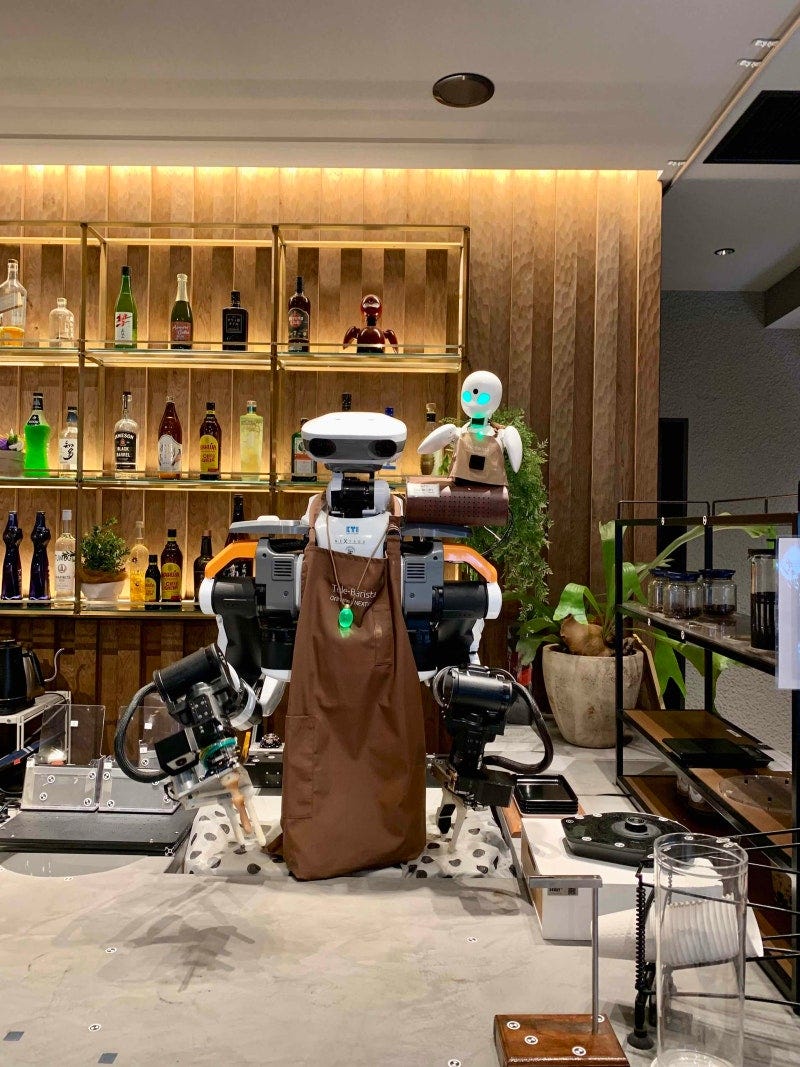 한편, 매장에는 ‘텔레 바리스타(Tele-Barista)’가 커피를 내려주는 코너도 있어요. 파일럿이 원격 조종으로 원두를 고르고, 커피를 추출하죠. 텔레 바리스타는 오리히메와 생김새가 다른데요. ‘넥스테이지(NEXTAGE)’라는 범용 휴머노이드 로봇을 개발한 ‘카와다 테크놀로지스(kawada technologies)’, ‘카와다 로보틱스(Kawada Robotics)’와 공동 개발했어요. 얼핏 보면 넥스테이지처럼 보이지만, 어깨 위에 오리히메가 올라타 있죠. 대화 기능이 없는 넥스테이지 대신 오리히메가 고객에게 원두 종류를 안내하고, 취향에 맞춰 커피 선택을 도와줘요. 그 후 넥스테이지가 커피를 내리죠.