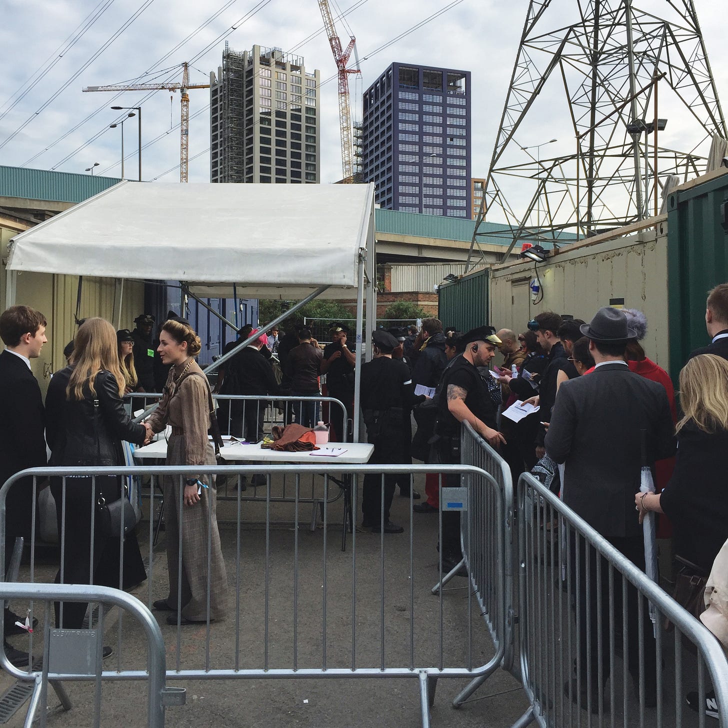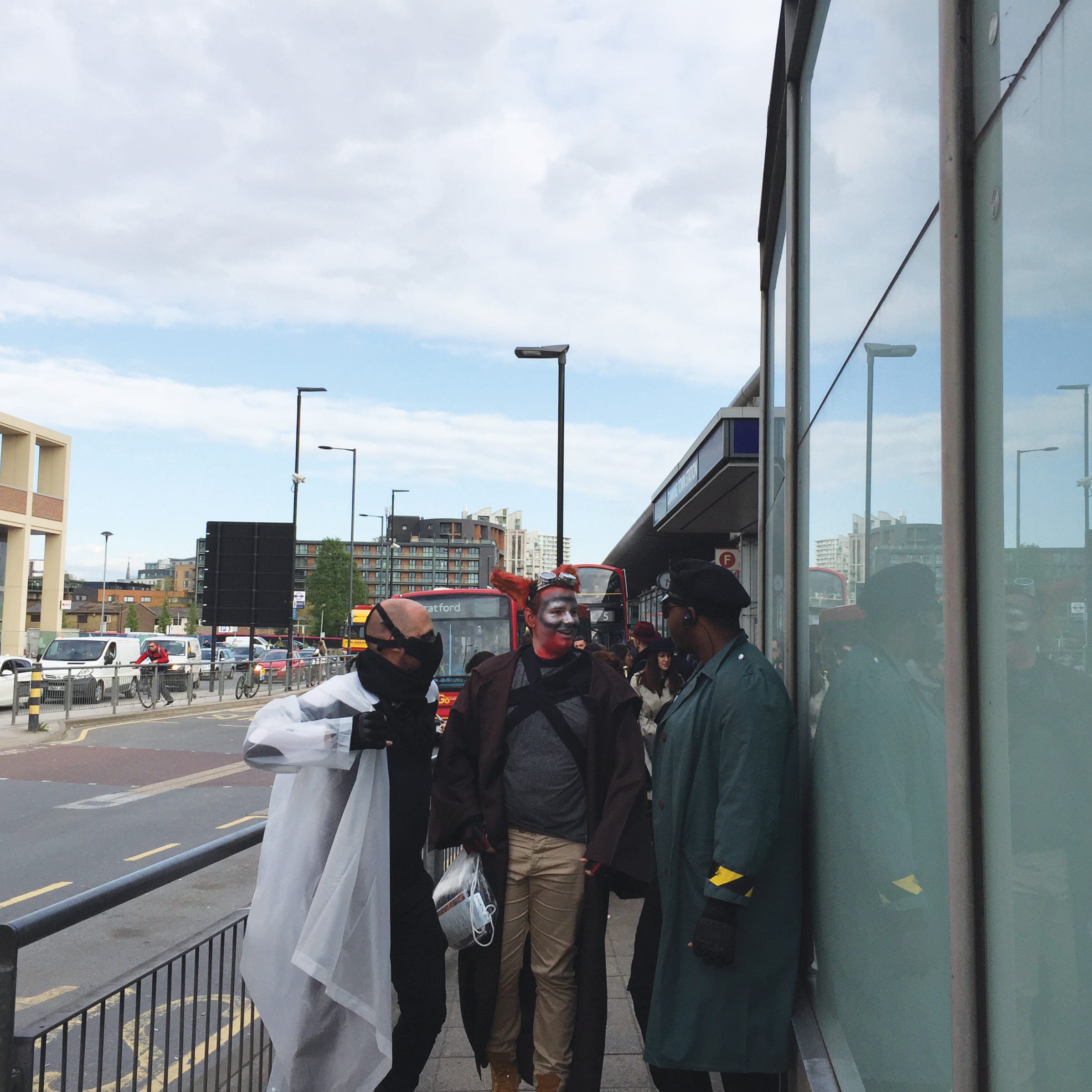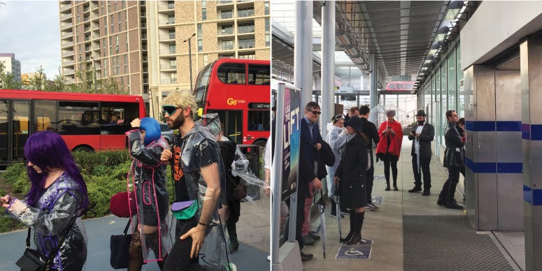영화 예매 시간에 맞춰 미팅 장소인 캐닝 타운(Canning Town) 역에 도착하면 흥미로운 풍경이 펼쳐져요. 역 곳곳에 미래 시민으로 분장한 사람들이 동행들을 기다리고 있고, 특수 경찰 분장을 한 스태프들이 영화를 볼 수 있는 장소를 은근슬쩍 안내하죠. 굳이 스태프들에게 물어보지 않더라도 코스프레한 무리가 이동하는 방향을 따라가면, 예매할 때 알려준 가상의 장소인 ‘월드 터미너스(World Terminus)’ 간판을 찾을 수 있어요.