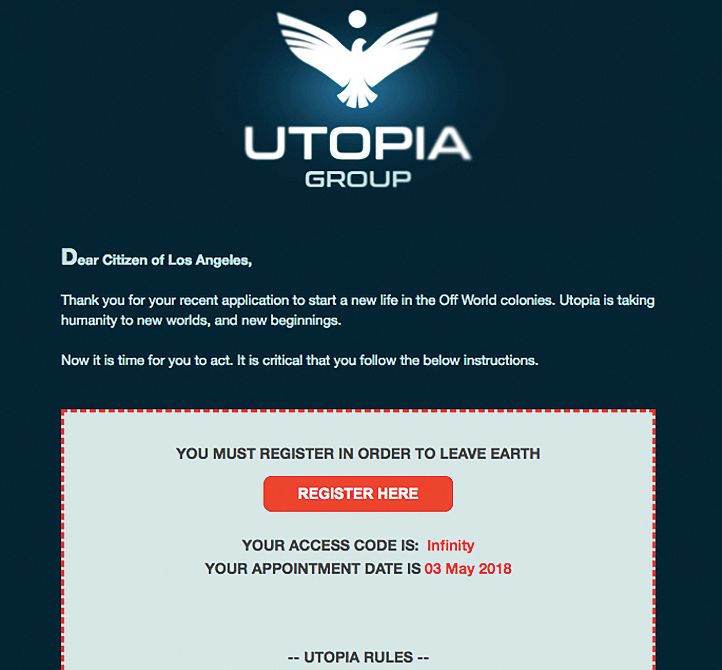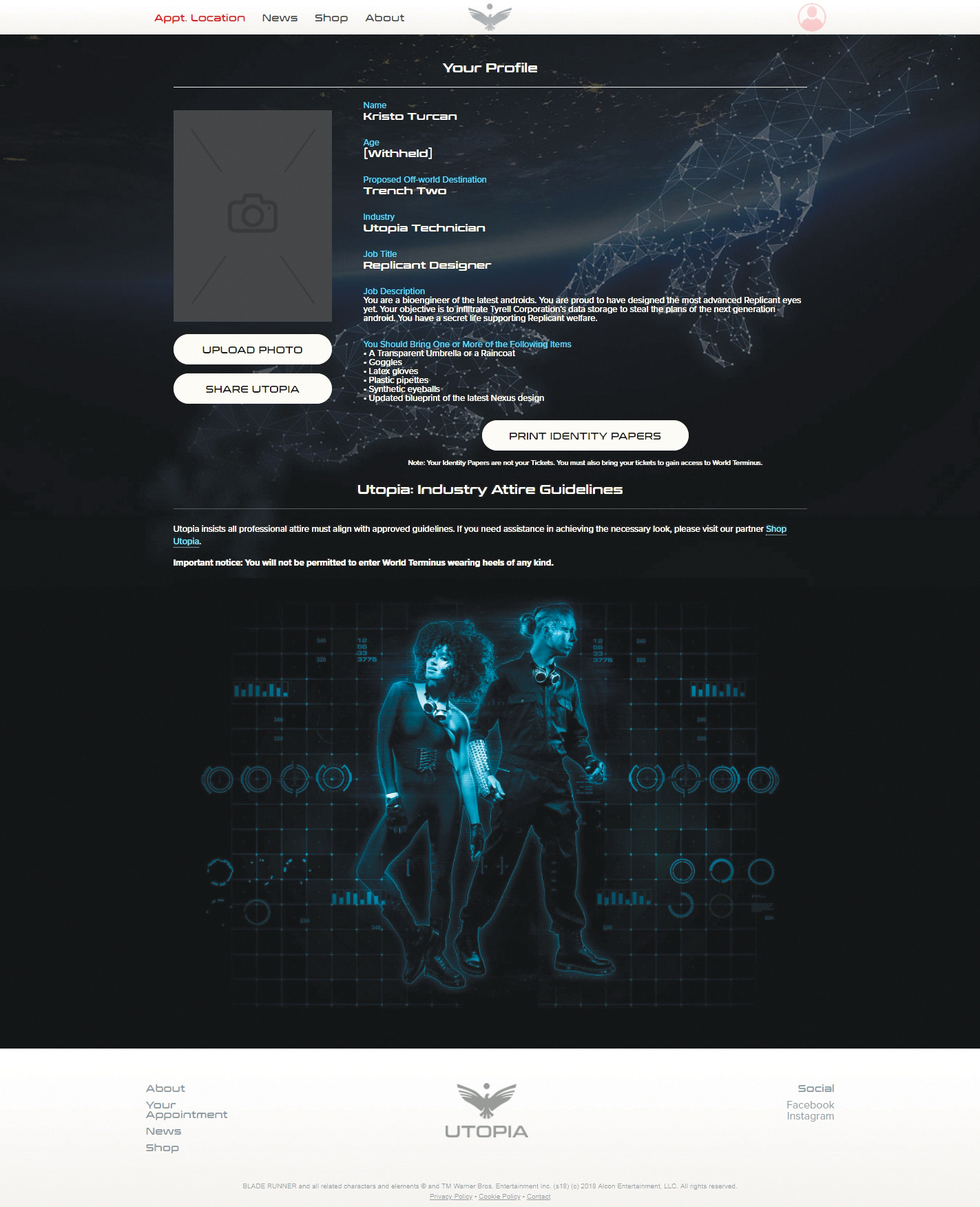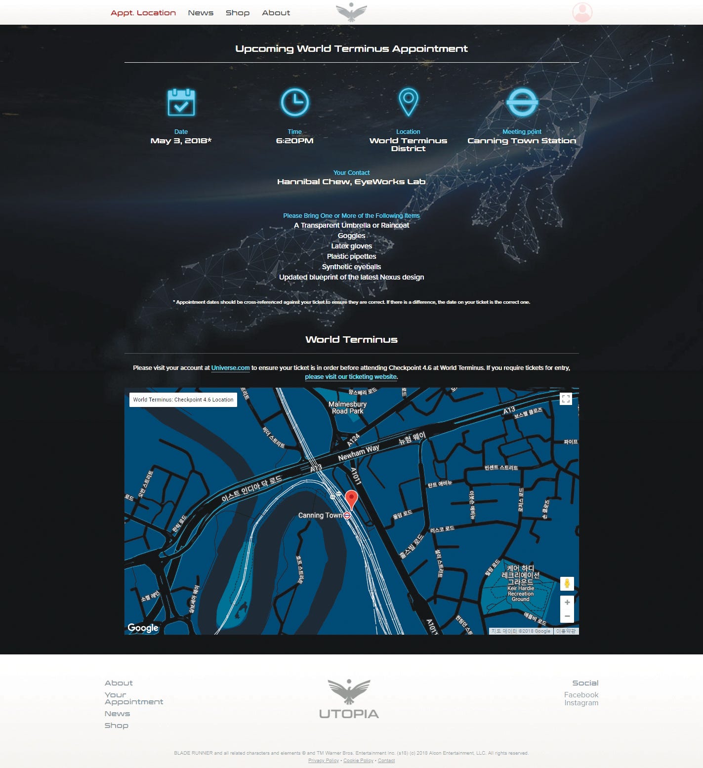 영화 티켓을 예매하면 이메일이 와요. 예매 확인증이 아니라 초대장에 가깝죠. 영화를 예매했으니 <블레이드 러너>의 세계로 초대한다는 의미에서 외부에 공개되지 않은 웹사이트 링크와 로그인할 수 있는 암호를 알려주는 거예요. 링크를 클릭하면 미래 사회의 인조 인간 스토리를 다루는 <블레이드 러너>의 분위기를 반영한 웹사이트로 연결돼요. 웹사이트 이름도 미래스러운 ‘라이브 유토피아(Live Utopia)’고요.