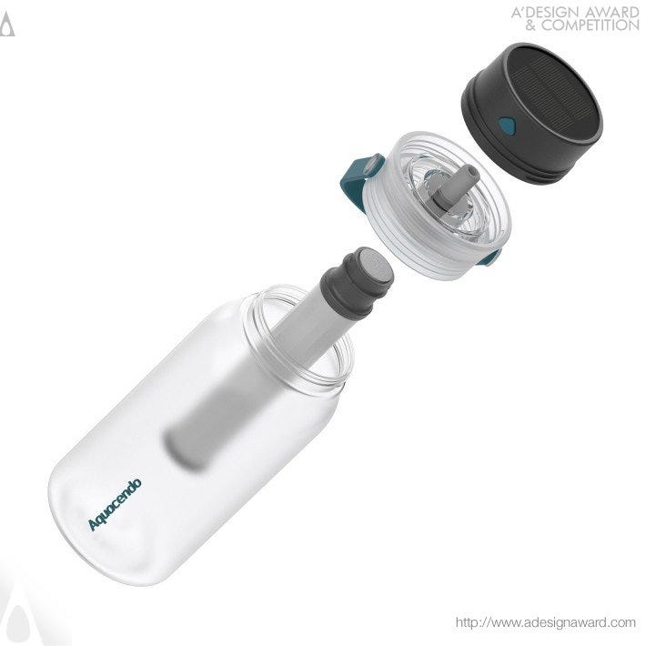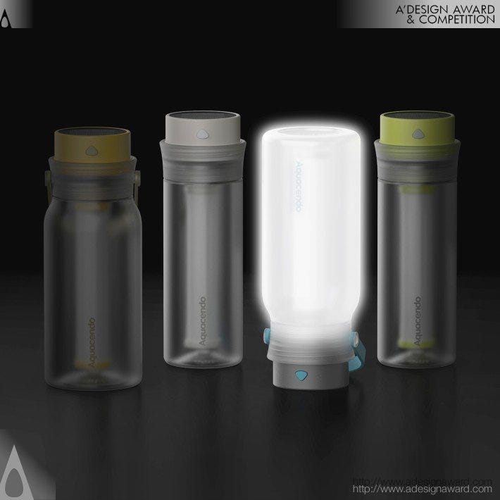 이 두 가지 문제를 동시에 풀어내려는 시도가 하나의 물병에서 나왔어요. 바로 2025년 A' Design Award & Competition에서 사회적 디자인(Social Design) 부문 골드 위너로 선정된 ‘아쿠아센도 라이트업 필터 보틀(Aquacendo LightUp Filtered Bottle)’이에요.