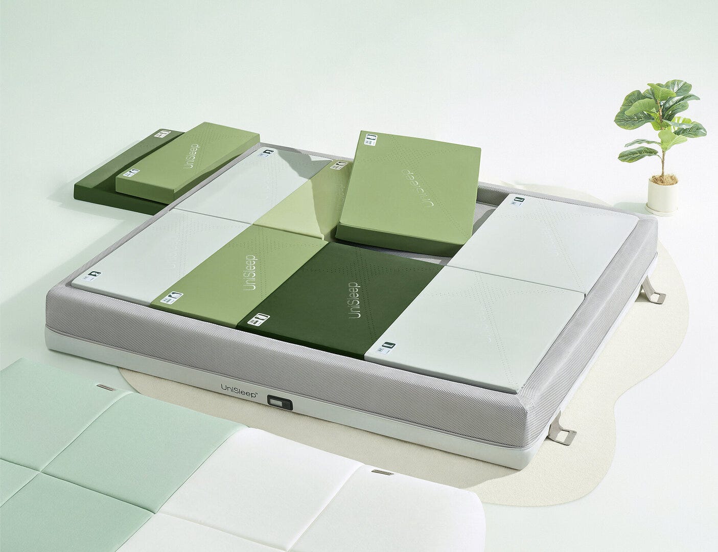 ‘유니슬립(UniSleep)’은 이에 대한 해결책을 제시한 브랜드예요. 1년간의 연구 끝에 2023년에 출시한 ‘큐브 모듈러 매트리스(Cubed Modular Mattress)’는 평범한 매트리스와는 모양이 달라요. 큐브 블록을 끼워 맞추듯, 고객이 여러 개의 매트리스를 스스로 선택해 조립하는 방식이거든요. 머리, 어깨, 허리, 다리 각 부위별로 필요한 지지력이 다르다는 점에 착안해, 매트리스를 맞춤 설계할 수 있도록 만든 거예요.