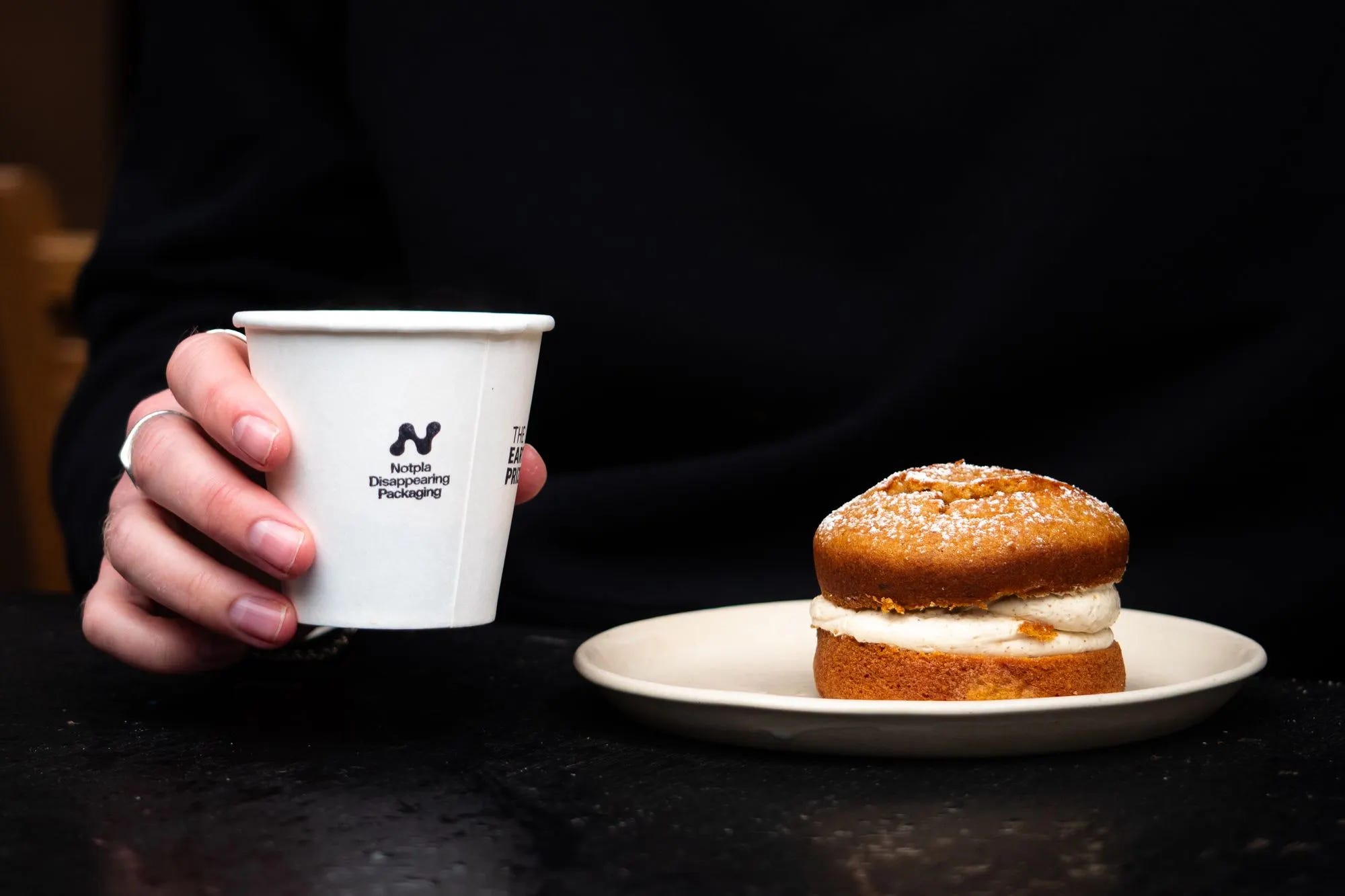 그런데 다른 포장용기나 오호와 달리, 이 에스프레소 컵은 아직 상용화된 건 아니에요. 플라스틱 코팅 대신 해조류와 식물 기반이 코팅이 적용된 건 맞지만, 낫플라의 완벽에 가까운 기준을 충족하지는 못했거든요. 기능적인 밀봉을 위해 바닥과 이음새 부분에 소량의 업계 표준 접착제가 사용되고 있는데, 낫플라는 이 부분까지도 완전한 천연 소재로 만들고자 해요. 천연 접착제를 사용하는 2세대 컵은 현재 개발 중이죠.