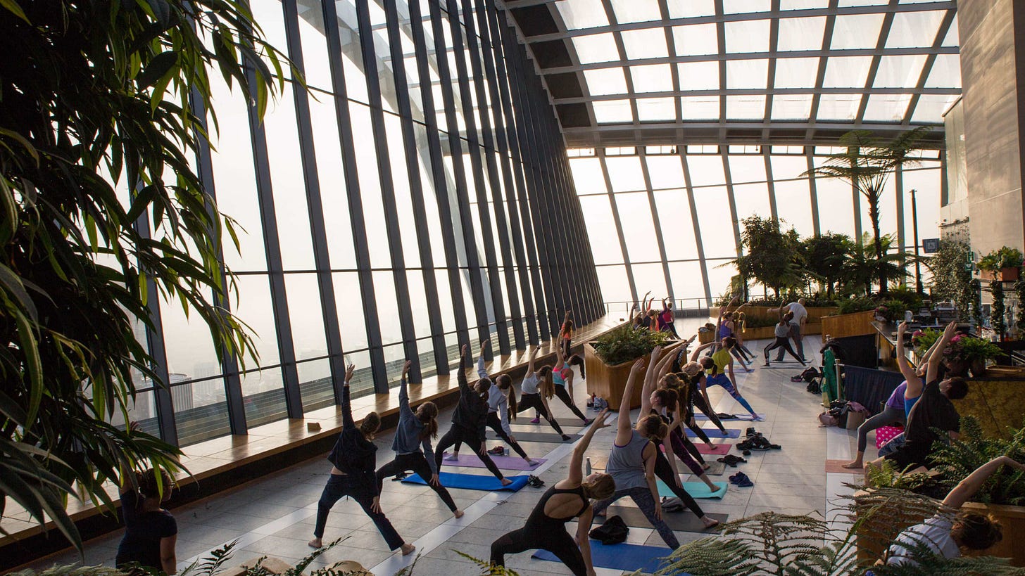 마지막으로는, 틈새 시간을 활용한 프로그램이에요. 하루 중 비교적 한산한 오전 시간에는 요가 프로그램을 운영해요. 빌딩 숲과 초록 식물에 둘러싸인 공간에서 프라이빗하게 진행되죠. 오전 8시에 시작해 1시간 동안 진행되며, 요가 후엔 건강 음료나 커피를 함께 판매해 객단가를 높여요.