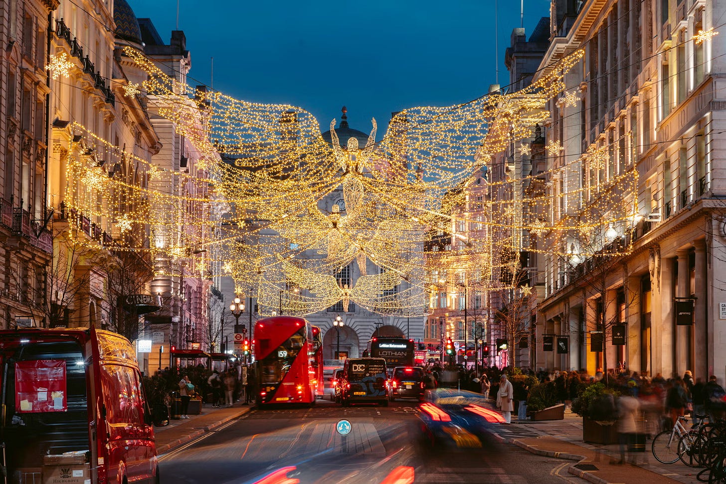이제 12월에 접어 들었으니, 본격적인 크리스마스 시즌이에요. 런던은 이미 11월부터 크리스마스 준비를 시작해 지금은 도시 전체가 완연한 크리스마스 무드에 젖어 들었어요. 옥스포드 스트리트, 코벤트 가든, 리젠트 스트리트 등 런던 곳곳에는 이미 반짝이는 조명, 대형 트리, 활기찬 크리스마스 마켓이 펼쳐지고 있어요.