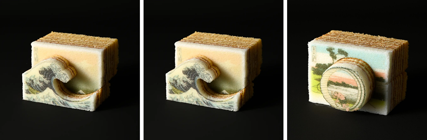 귀여운 디저트로 자리 잡던 어느 날, 카타누키야는 또 한번 도전하는데요. 2025년 9월, ‘가츠시카 호쿠사이 명화 시리즈’를 출시한 거예요. 호쿠사이는 일본을 대표하는 화가로, 그의 우키요에 작품은 디테일이 생명이에요. 미세한 그라데이션과 농담이 작품의 핵심이라, 일반적인 푸드 프린터로는 구현이 어렵다고 여겨졌죠. 그럼에도 불구하고, 카타누키야는 일부러 이 명화를 그려보기로 했어요. 이제는 캐릭터의 귀여움이 아니라, 기술력을 증명하고 싶었으니까요.