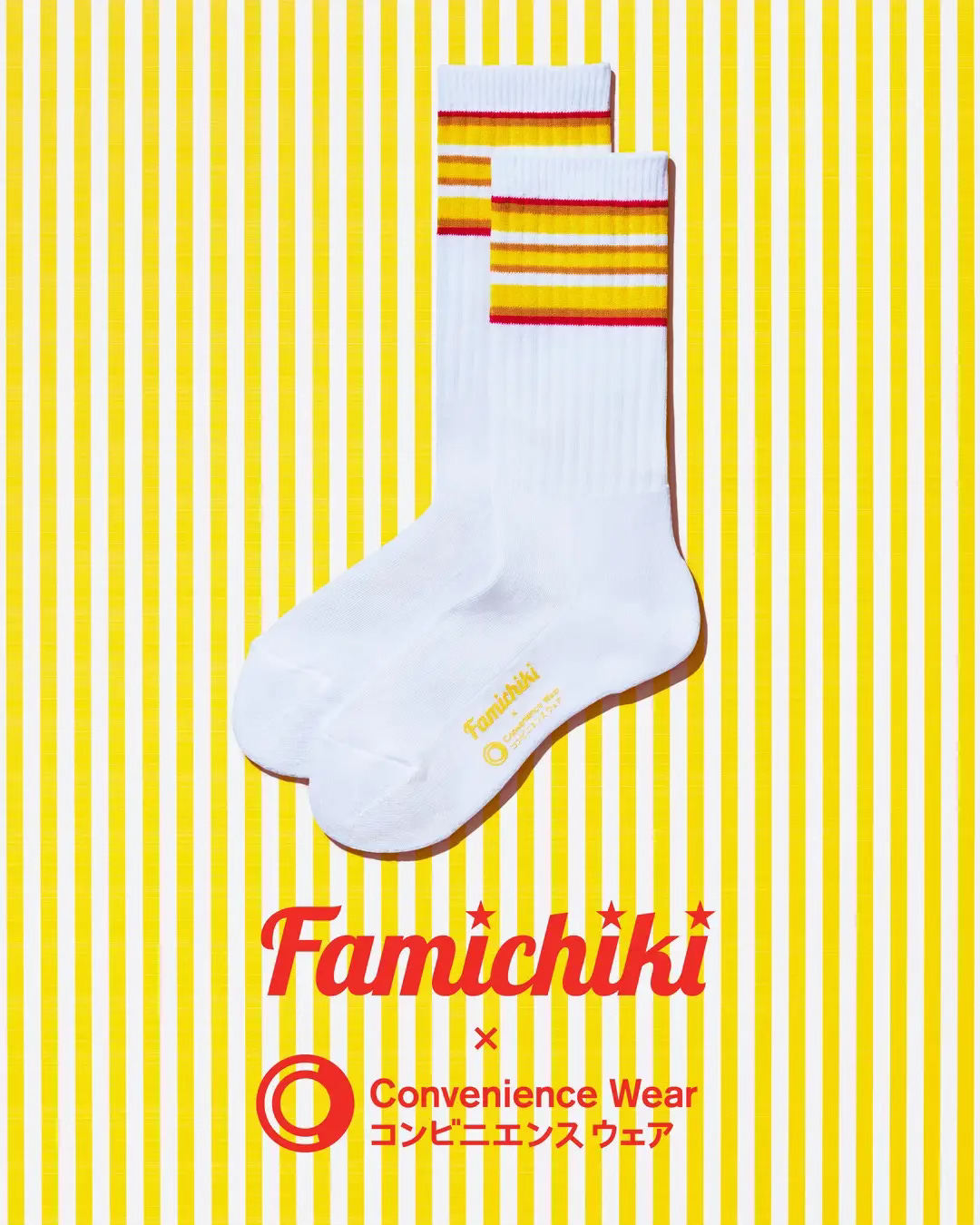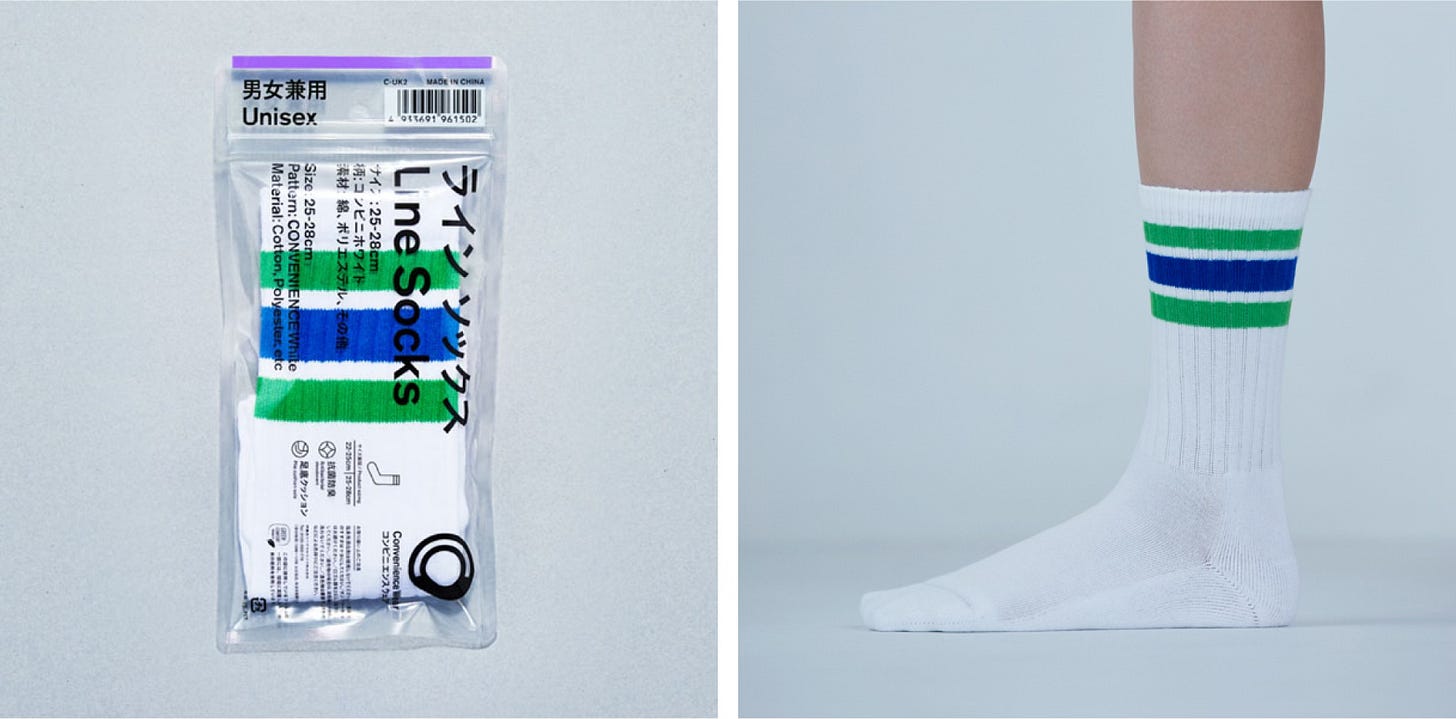 하지만 패밀리마트의 컨비니 웨어는 단순히 이런 긴급 수요를 위한 생필품에 그치지 않았어요. 패밀리마트의 브랜드 컬러로 ‘라인 삭스’를 디자인해 지금까지 무려 약 2,800만 켤레 이상 판매했어요. 패밀리마트 인기 치킨 ‘파미치키’를 오마주한 라인 삭스로 패밀리마트의 위트를 뽐내기도 했죠. 이 밖에도 컨비니 웨어는 반바지, 카디건, 에코 배낭 등 라인업을 늘려가며 편의점 의류의 새 장을 써나가고 있어요.