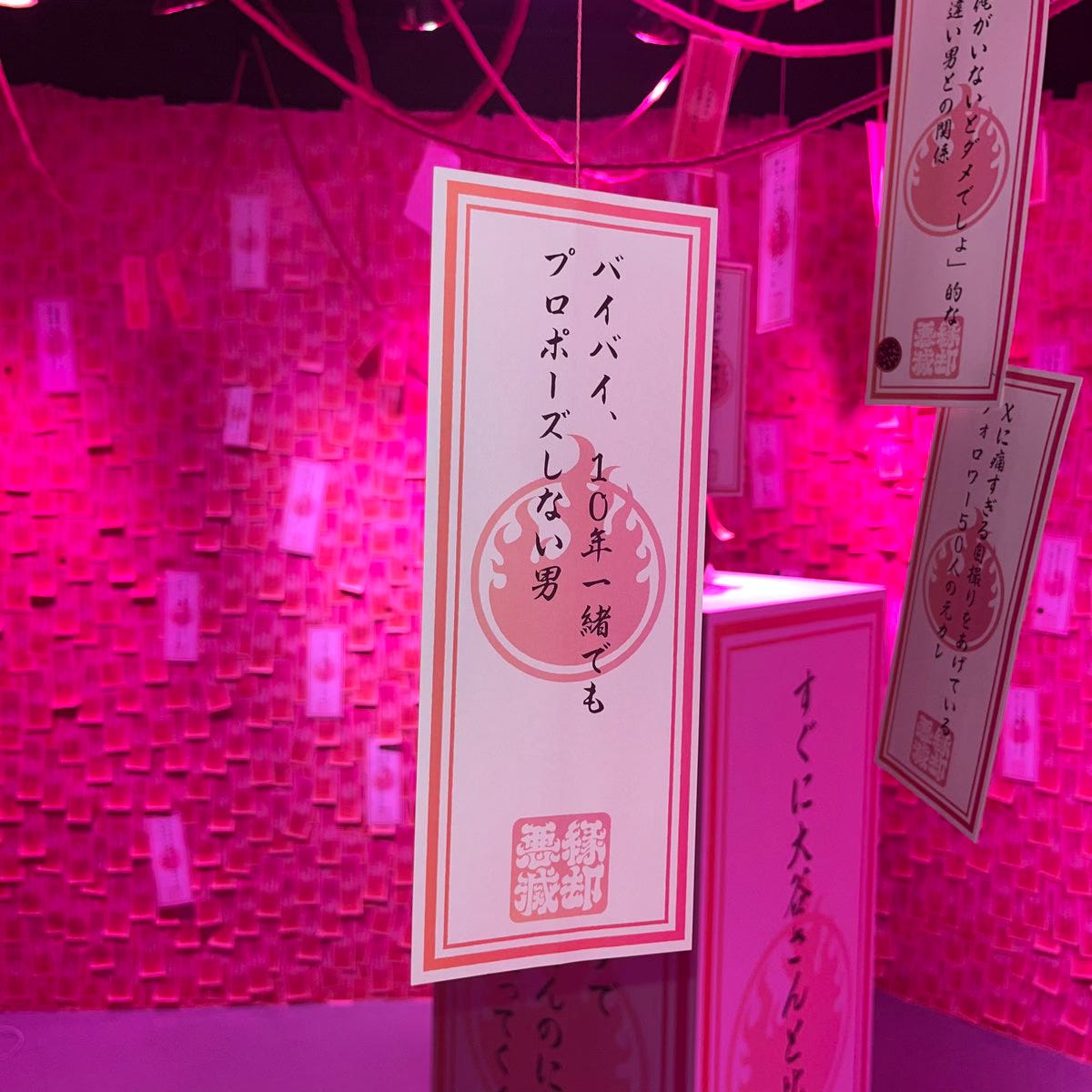 대표적인 코너는 ‘태워버려야겠다 전시’였어요. 신사에서 사람들이 물건이나 부적을 태우는 ‘오타키아게(お焚き上げ)’라는 풍습에서 아이디어를 얻었죠. 틴더는 이번 틴샤를 오픈하기 전, 틴더의 공식 X 계정을 통해 연애, 우정, 직장 동료 등 다양한 관계에서 잊고 싶은 인연에 대한 이야기를 모집했어요. 그리고 그 중 일부 사연을 선발해 전시를 연 거예요. 관람객들은 전시된 사연에 ‘동정 스티커’를 붙여 공감을 표시하거나, 즉석으로 자신의 이야기를 적어 붙이기도 했어요.