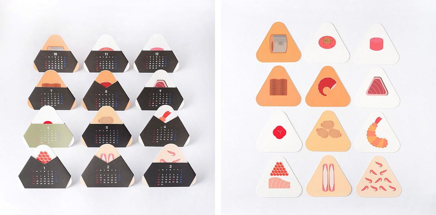 일본식 삼각김밥인 ‘오니기리’는 일본에서 가장 사랑 받는 음식 중 하나예요. 오니기리는 밥 안에 다양한 토핑을 넣거나 밥에 양념을 하는데요. 이 캘린더는 제철 해산물을 활용한 12가지 맛 오니기리를 테마로 디자인되었어요. 12가지 맛은 도쿄의 유명한 수산 시장인 츠키지 시장에서 영감을 받았죠. 달력이 일본의 식문화를 전달하는 매개체가 된 셈이에요. 이 달력은 같은 컨셉으로 ‘벤또’, ‘도넛’ 버전 등도 있어요.