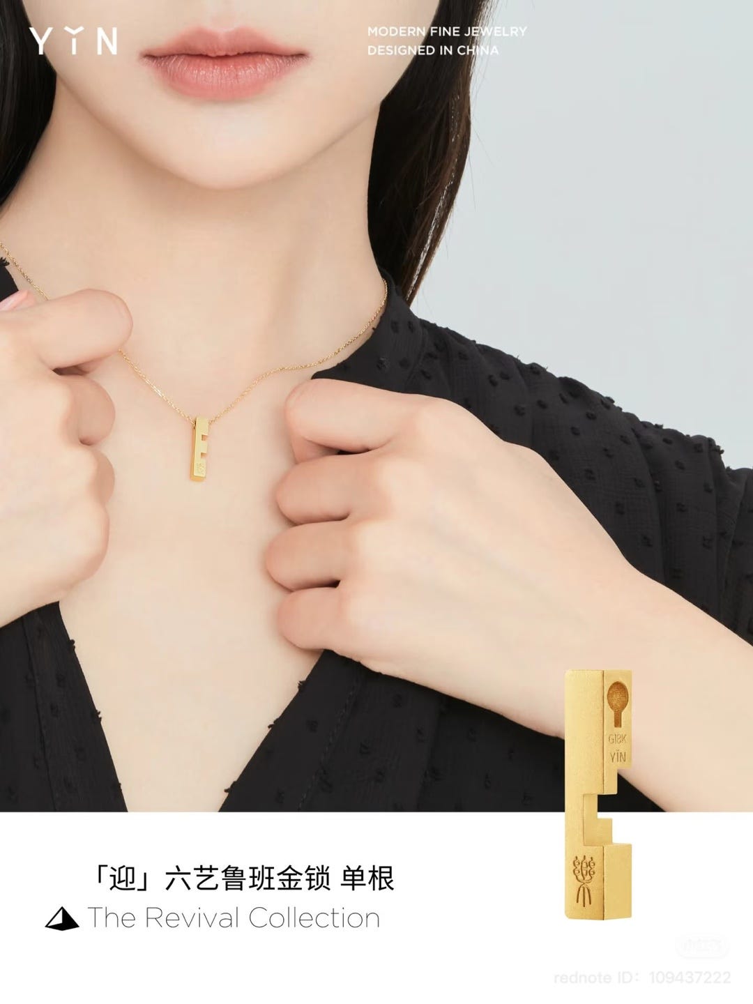 2021년 출시된 ‘잉(迎, 맞이하다)’ 시리즈는 중국의 전통문화를 현대적으로 해석한 대표적인 사례예요. 중국에서는 아이가 태어났을 때 장수를 기원하며 자물쇠를 주는 전통이 있는데요. 인은 자물쇠 중에서도 춘추시대부터 지혜를 시험하는 자물쇠 장난감, ‘노반쇄(鲁班锁)’에서 영감을 받아 목걸이 펜던트를 디자인했어요.