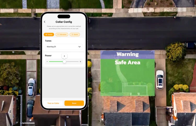 사텔라이 칼라의 핵심 기능은 ‘버추얼 울타리(Virtual Fence)’예요. 우선 반려견의 목에 스마트 목걸이를 달아준 뒤, 앱에서 지도를 열고 몇 번의 터치만으로 울타리를 설정하면, 그곳이 바로 반려견의 활동 영역이 돼요. 실물 울타리가 없으니 별도의 설치 과정은 필요 없어요. 지형의 제약도 받지 않죠. 전세계 어디서든 원하는 범위를 자유롭게 설정할 수 있고요.