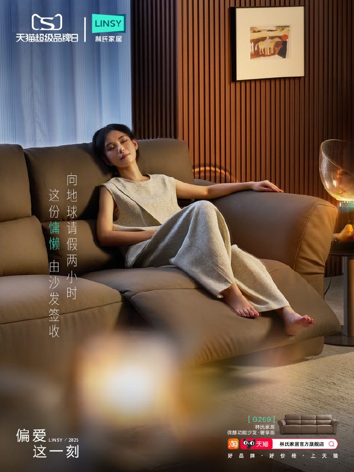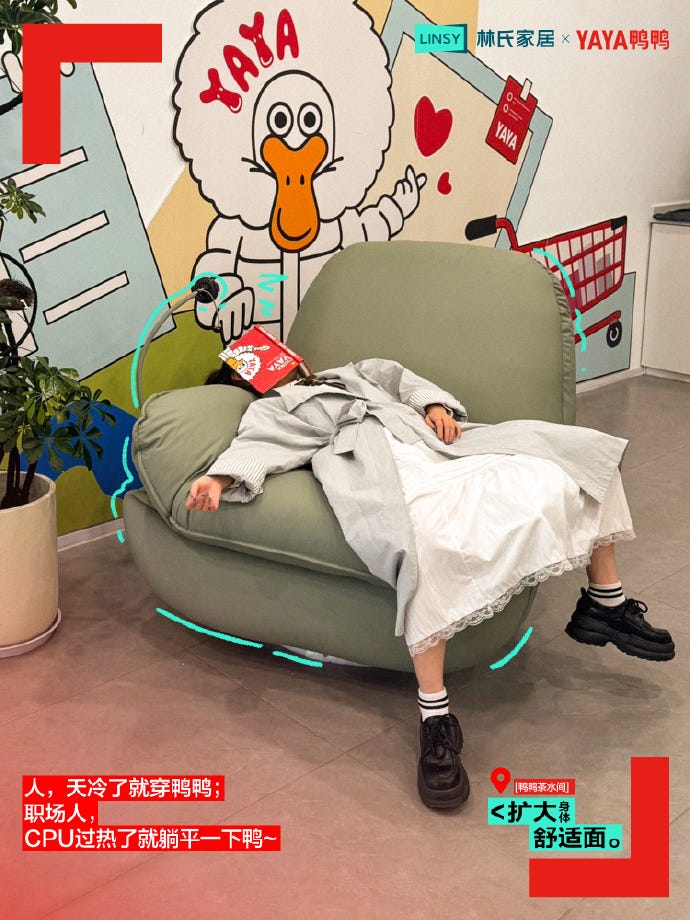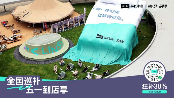 또한 린지 가구는 집 안에서의 회복 경험을 바깥으로까지 확장했어요. 타깃이 된 건 텐센트, 알리바바 등 대기업들이 몰려있는 지역인 선전이에요. 통근 요충지인 지하철역에 직장인들이 잠시 쉴 수 있는 공간을 만들었죠. 그러다 심지어 직장 안으로 들어가기도 했어요. 레노버, 즈롄자오핀 등 8개 기업의 휴게실에 가구를 설치해 직원들이 잠시나마 여유를 찾을 수 있는 장소를 만든 거예요. 광둥성에서는 건물 바깥에 12m 크기의 초대형 매트리스를 설치하며 간절히 눕고 싶어 하는 직장인들의 공감을 모으기도 했고요.