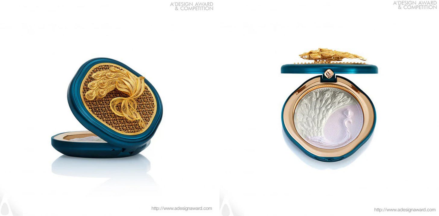 화시즈의 또 다른 대표작은 Gold Filigree Peacock Face Powder예요. A' Design Award에서 수상한 이 제품은 중국 전통에서 상징적 존재인 ‘공작’을 화려하게 담아냈어요. 세밀한 금세공 기법(filigree)을 활용해 케이스 전면에 공작이 활짝 날개를 펼친 듯한 입체감을 구현했죠. 단순한 파우더가 아니라, 열어보는 순간 작은 보석함을 여는 듯한 감각적 경험을 선사하기도 해요.