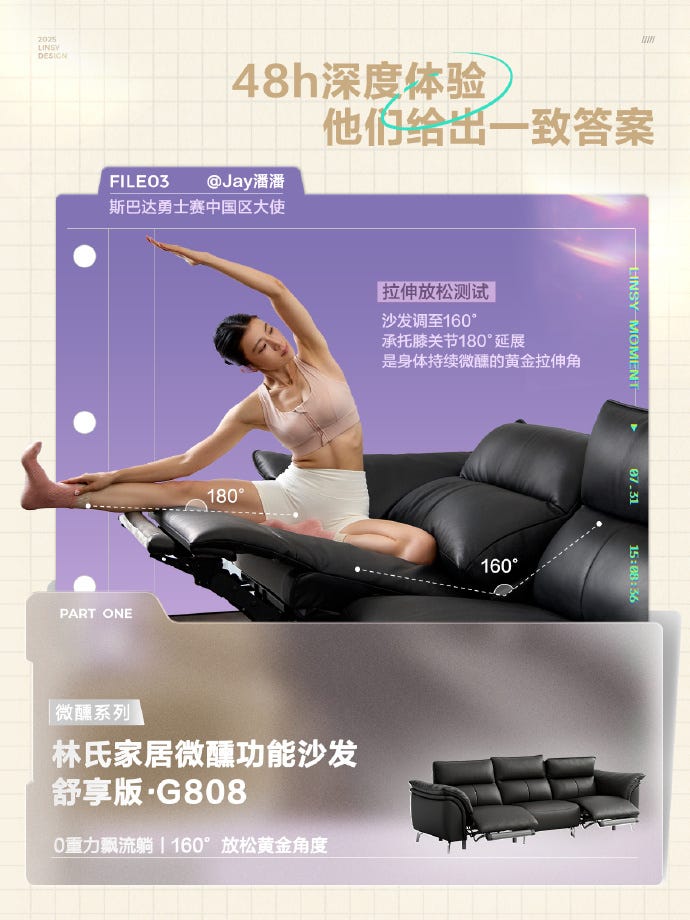 본격적인 활동은 지금부터 시작이에요. 린지 가구는 현대인의 건강한 라이프를 돕기 위해 크로스오버 전략을 선택했어요. 중국의 대표적인 모바일 헬스 앱 ‘킵(Keep)’과 협업해 집에서 할 수 있는 스트레칭 프로그램을 개발하고, 4억 명의 사용자 운동 데이터를 기반으로 과학적인 트레이닝 시스템을 구현했죠. 물론 운동이 끝나고 나면 회복할 수 있도록 매트리스와 전동 소파를 출시해 일체형 홈 케어 경험을 제안했고요. 린지 가구가 ‘우리는 모든 가구가 보이지 않는 휴식 코치라고 믿는다’고 강조한 데는 이유가 있었어요.