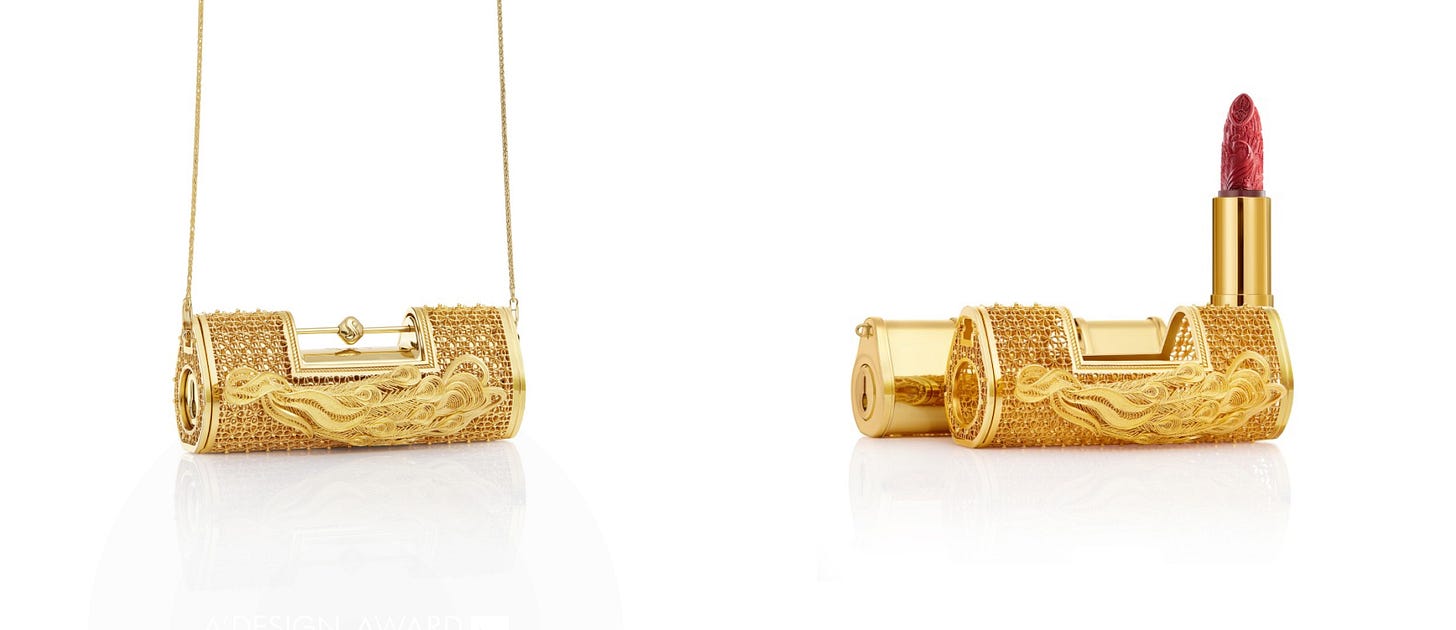 A' Design Award의 또 다른 수상작인 Gold Love Lock Lipstick은 중국 고유의 ‘자물쇠’ 모티프를 활용했어요. 고대 중국에서 자물쇠는 영원한 사랑과 약속을 상징하는데, 화시즈는 이를 립스틱 패키지로 옮겨왔죠. 입술을 물들이는 화장품에 사랑의 상징을 결합한 점이 인상적이에요. 특히 금속 질감의 케이스와 정교한 패턴은 고급스러움과 전통미를 동시에 살려, 선물용으로도 큰 인기를 끌고 있어요.