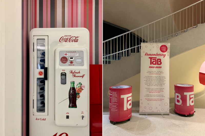 이밖에도 곳곳에 클래식 자동차, 옛날 디자인의 코카콜라 자판기, 복고풍의 포스터 등 1960년대를 상징하는 오브제들을 놓아두어 당시의 분위기를 연출했어요. 또한 로비 한쪽에는 2020년 12월에 단종된, 1칼로리 콜라인 ‘코카콜라 탭’ 모형과 포스터를 전시해 놓은 공간이 있어요. TWA 호텔이 현재는 마실 수 없는 코카콜라 탭에 공간을 할애하면서 일종의 은퇴 파티를 열어주는 이유는 이 음료가 1962년에 탄생했기 때문이에요.