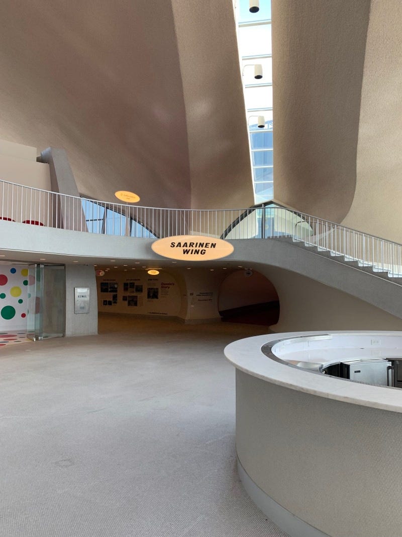 이 터널을 윙이라고 부르는데, 양쪽 윙에는 각각 사람 이름을 딴 명칭이 붙어 있어요. 그중에 하나가 사리넨 윙(Saarinen wing)이에요. 윙에 붙어 있는 이름의 주인공인 에로 사리넨은 TWA 호텔을 디자인한 핀란드 출신의 건축 디자이너예요. 아치형의 구조적 곡선과 이성적이고 논리적인 특징의 설계로 유명해요. 건축 디자인뿐만 아니라 제품 디자인도 하는데 그가 디자인한 작품으로는 튤립 의자가 널리 알려져 있죠.