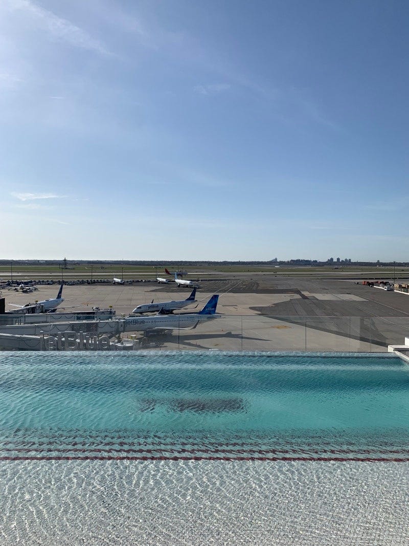 TWA호텔의 또다른 볼거리는 루프탑이에요. 루프탑에는 수영장이 있어요. 전망이 탁 트여 있으니 일종의 인피니티 풀인 셈이죠. 그런데 이 수영장에서 볼 수 있는 전망은 자연이 아니라 활주로예요. 활주로에 뜨고 내리는 비행기를 눈앞에서 보면서 수영을 즐길 수 있죠.