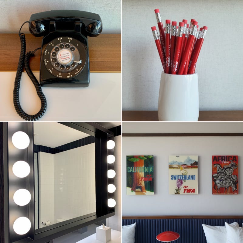 예를 들어 볼게요. 우선 빨간색의 메인 컬러와 볼드하면서도 복고풍의 폰트가 TWA 호텔의 전반적인 분위기를 잡아줘요. 객실에는 검정색 다이얼식 전화기가 비치되어 있고, 펜은 볼펜 대신 지우개 연필이 잔득 꽂아두었으며, 버튼이나 옷걸이 등은 구리 소재로 제작했어요. 또한 화장실에는 할리우드 컨셉의 버블 전구가 달린 거울이 있죠. 벽에도 복고풍 디자인의 포스터를 걸어 두어 톤앤 매너를 유지시켜요.