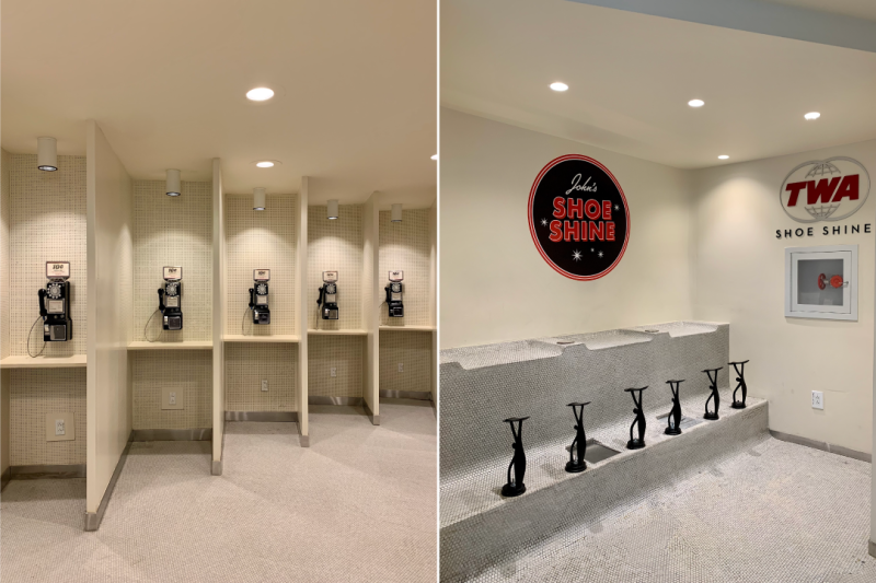 공용이라고 다르지 않아요. 다른 점이 있다면 컨셉을 위해 사용성이 떨어지는 시설도 구성했다는 거죠. 대표적인 게 공중전화 부스예요. 검정색 빈티지 Western Electric 500 로터리 전화기를 여러 대 설치해 놓았죠. 실제로 전화를 걸 수 있지만, 실제로 쓰는 사람은 거의 없죠. 또한 높은 단상에 앉아서 구두를 닦는 장소도 마련해 놓았어요. 실제로 구두닦에 서비스를 하지 않으니 컨셉인 셈이죠.