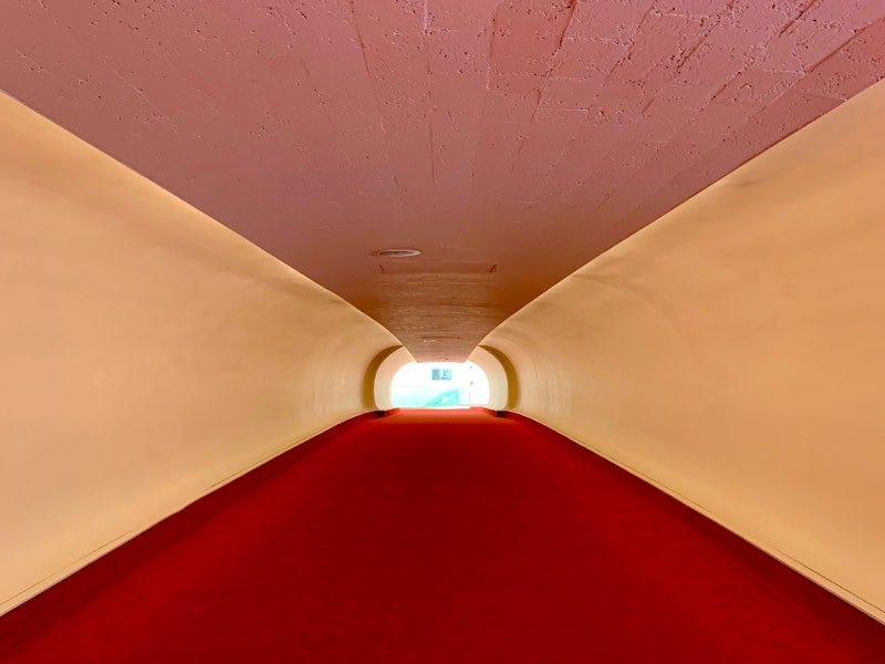 TWA 호텔은 건축 디자인도 유려해요. 외관은 새가 비행하는 모양처럼 유선형으로 이루어져 있고, 내부 공간도 곡선을 중심으로 균형감 있게 구성되어 있죠. 이런 건물 디자인에 화룡점정을 찍는 곳이 로비에서 호텔 객실로 이어지는 통로예요. 이곳은 건축 디자인적으로 대단히 특별한 건 아닐지 몰라요. 하지만 그곳을 지나가는 경험 디자인만큼은 TWA 호텔에 대한 호감을 끌어올리기에 충분해요. <캐치 미 이프 유 캔>에서 등장하는 장면이 바로 이 터널 통로예요.