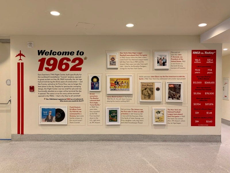 이 사건들의 공통점은 무엇일까요? 바로 1962년에 일어난 일입니다. 언뜻 봐도 1962년은 영화, 스포츠, 음악 등 문화가 피어나던 시기예요. 이 해에 또 무슨 일이 있었냐면요, TWA 터미널인 TWA Flight Center가 오픈했어요. 여행에 대한 수요도 늘어나기 시작했다는 뜻이죠.